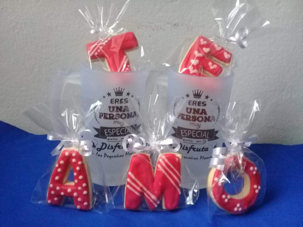 Jarras de cerveza de vidrio transparentes o esmeriladas impresas con diseño de enamorados y 5 galletas que pueden variar el diseño. Galletas frescas y en envoltorios finamente decoradas y en caja.